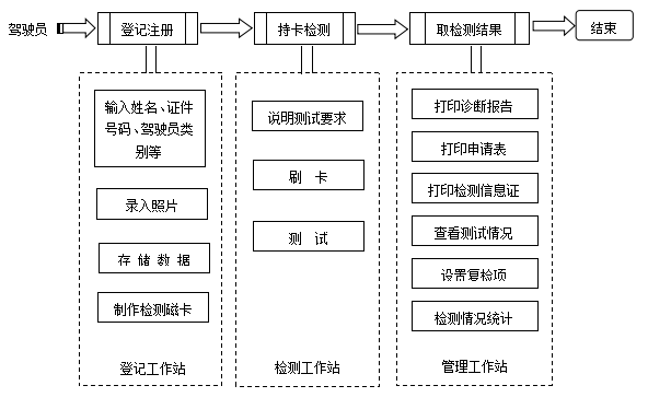 駕駛適性檢測(cè)系統(tǒng)的使用包括登記工作站、檢測(cè)工作站和管理工作站的使用及系統(tǒng)的維護(hù)等。完整的駕駛員檢測(cè)流程如下: