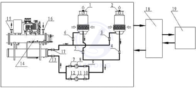 附圖1中:1為第一冷卻塔、2為第二冷卻塔、3為第二冷卻塔進(jìn)水調(diào)節(jié)閥、4為第二冷卻塔出水調(diào)節(jié)閥、5為第一冷卻塔出水調(diào)節(jié)閥、6為第一冷卻塔進(jìn)水調(diào)節(jié)閥、7為第一水泵出口調(diào)節(jié)閥、8為第一水泵、9為第一水泵進(jìn)口調(diào)節(jié)閥、10為第二水泵進(jìn)口調(diào)節(jié)閥、11為第二水泵、12為第二水泵出口調(diào)節(jié)閥、13為冷凝器進(jìn)水調(diào)節(jié)閥、14為冷水機(jī)組、15為蒸發(fā)器出口、16為蒸發(fā)器進(jìn)口、17為冷凝器出水調(diào)節(jié)閥、18為PLC控制系統(tǒng)、19為計(jì)算機(jī)系統(tǒng)。
