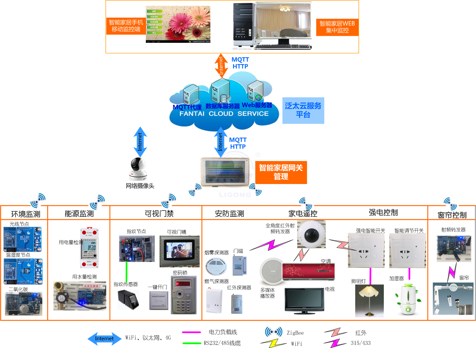 該系統(tǒng)綜合運(yùn)用傳感器采集、無線傳感器網(wǎng)絡(luò)、自動(dòng)控制、嵌入式系統(tǒng)開發(fā)、網(wǎng)絡(luò)通信、Android移動(dòng)應(yīng)用開發(fā)、Web應(yīng)用開發(fā)等物聯(lián)網(wǎng)技術(shù),將家居環(huán)境傳感器、終端控制器、家用電器、家居網(wǎng)關(guān)等集成,實(shí)現(xiàn)家居生活環(huán)境的自動(dòng)監(jiān)測(cè)、自動(dòng)調(diào)節(jié)、安防報(bào)警、視頻監(jiān)控、遠(yuǎn)程監(jiān)控等功能,貼近實(shí)際智能家居系統(tǒng),為物聯(lián)網(wǎng)專業(yè)教學(xué)提供了一個(gè)完備的工程應(yīng)用實(shí)訓(xùn)系統(tǒng)。