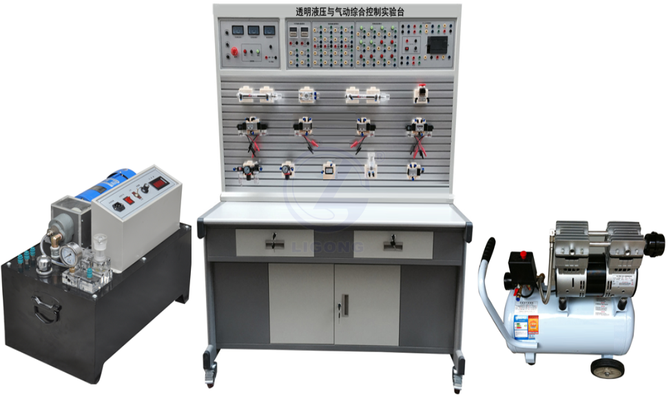 透明液壓與氣動綜合控制實驗臺是我公司根據(jù)高校機電一體化對氣、電、液控制的教學大綱要求,我公司液壓PLC控制與氣動與PLC實訓裝置的優(yōu)點,采用了開放型綜合實訓臺結(jié)構(gòu),廣泛征求專家教授與老師的意見,經(jīng)不斷創(chuàng)新改進研制而成的。是目前集氣動控制技術(shù)、液壓傳動控制技術(shù)以PLC控制的理想的綜合性實訓設備。實訓可以讓學生直觀、感性地對比、了解氣、電、液各自具有的特點、特色、及優(yōu)缺點等。