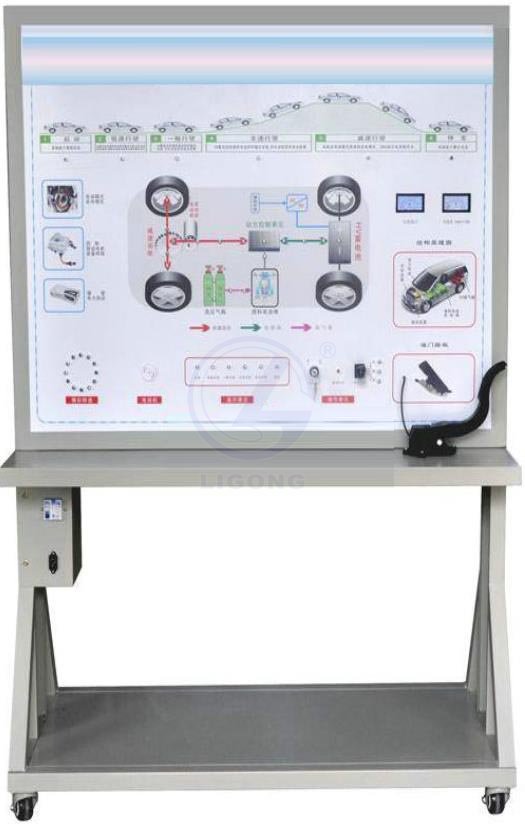 汽車燃料電池系統(tǒng)示教板由啟動開關(guān)、油門踏板、擋位開關(guān)、制動開關(guān)、數(shù)字轉(zhuǎn)速表、電流指示表等,并輔以發(fā)光二極管進行系統(tǒng)流向的動態(tài)指示,加速度傳感器、12V開關(guān)電源、大型彩色噴繪電路原理圖、控制面板、可移動臺架、使用操作手冊等。