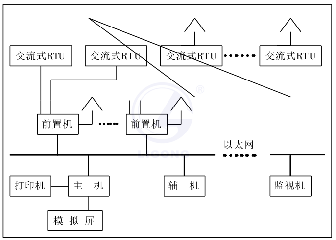 調(diào)度控制中心部分由前置機(jī)、主機(jī)、輔機(jī)、監(jiān)視機(jī)、模擬屏、局域網(wǎng)等組成。前置機(jī)根據(jù)各個(gè)廠站協(xié)議的不同, 負(fù)責(zé)從各個(gè)廠站的 RT U 接收或請求發(fā)送/ 接收現(xiàn)場的數(shù)據(jù), 然后根據(jù)協(xié)議對接收到的數(shù)據(jù)進(jìn)行解包, 最后將解包后的數(shù)據(jù)放到網(wǎng)絡(luò)上供各類處理機(jī)實(shí)時(shí)接收處理??紤]到機(jī)場站點(diǎn)多的特殊情況,支持多前置機(jī)方案, 每個(gè)前置機(jī)最多可以采集 16 個(gè)站的數(shù)據(jù)。主機(jī)/ 輔機(jī)/ 監(jiān)視機(jī)均從網(wǎng)上接收各類采集數(shù)據(jù), 對接收到的數(shù)據(jù)做進(jìn)一步的工程化加工處理、刷新當(dāng)前已打開的各個(gè)畫面上的開關(guān)狀態(tài)、動(dòng)態(tài)數(shù)據(jù)和實(shí)時(shí)曲線, 同時(shí)還要根據(jù)不同的機(jī)器類型確定是否響應(yīng)用戶的各類請求和是否保存各類歷史數(shù)據(jù)等。局域網(wǎng)是網(wǎng)上各計(jì)算機(jī)之間的連接和通信的通道, 負(fù)責(zé)各計(jì)算機(jī)之間的實(shí)時(shí)信息傳輸, 并實(shí)現(xiàn)網(wǎng)上數(shù)據(jù)、設(shè)備共享。