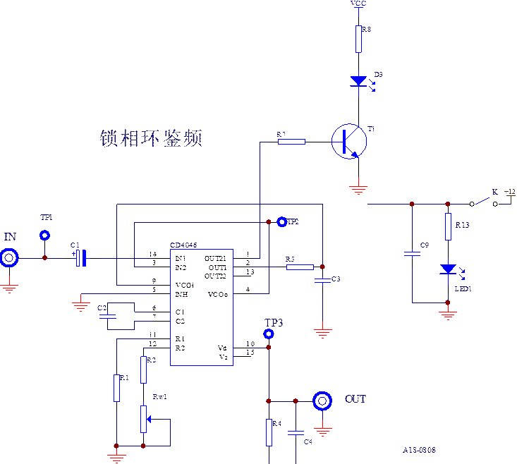 采用CD4046鎖相環(huán)集成芯片來(lái)實(shí)現(xiàn)鑒頻,其鑒頻實(shí)際電路如圖11-4所示。