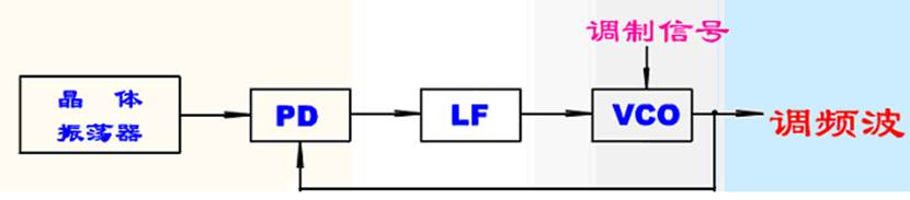 實(shí)現(xiàn)鎖相調(diào)頻的條件是調(diào)制信號(hào)的頻譜要處于低通濾波器通帶之外。使壓控振蕩器的中心頻率鎖定在穩(wěn)定度很高的晶振頻率上,而隨著輸入調(diào)制信號(hào)的變化,振蕩頻率可以發(fā)生很大偏移。這種鎖相環(huán)路稱載波跟蹤型PLL。
