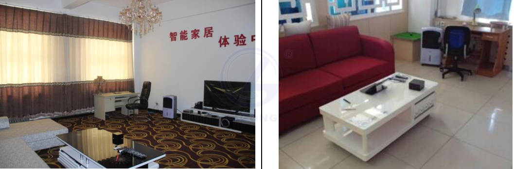 (7)家居裝修材料:采用現(xiàn)代居室裝修風(fēng)格,將智能設(shè)備直接融入裝修中,按照家庭裝修方式鋪設(shè)電源線路、玄關(guān)處安裝總開關(guān),分出大門、玄關(guān)、客廳、臥室、廚房等區(qū)域,放置沙發(fā)、電視柜、櫥柜、木桌、茶幾、花圃等輔助設(shè)備。