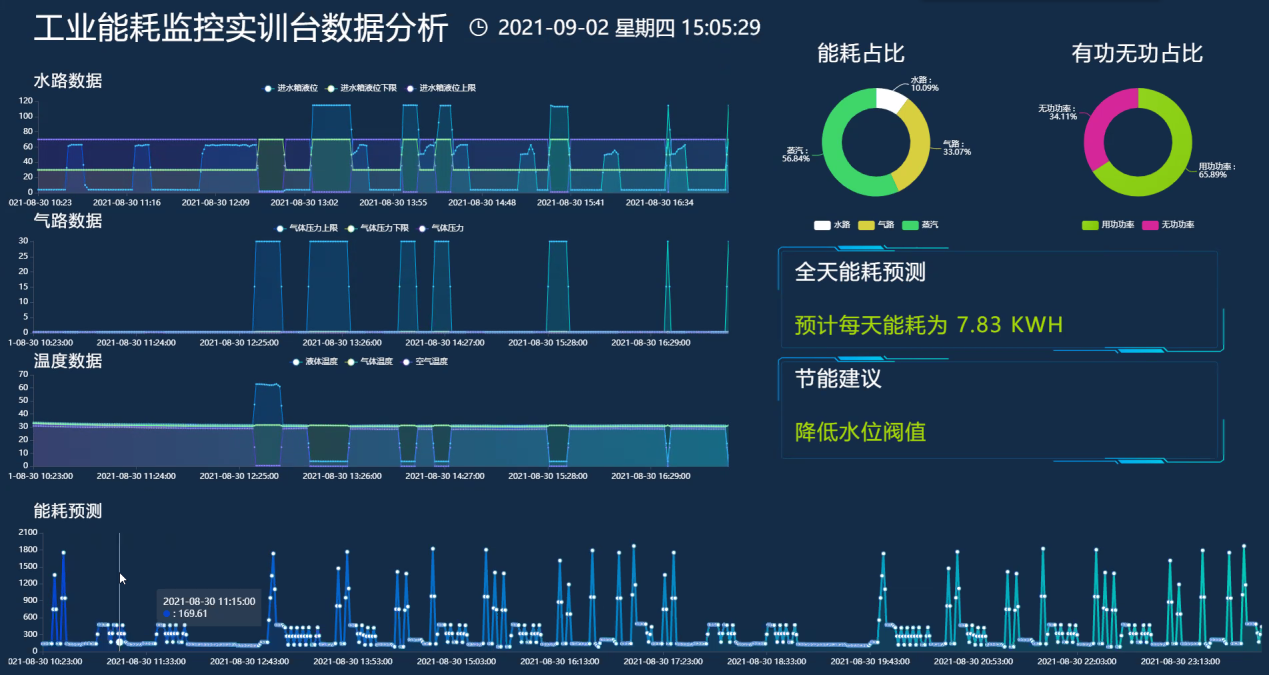 LGHL-04型 工業(yè)互聯(lián)能耗監(jiān)控實訓臺以水、氣、電能耗監(jiān)測為背景,采用液位計、流量計、溫度變送器、壓力變送器、電磁閥、水泵、氣泵、電氣控制箱、水箱等裝置模擬工業(yè)場景下的水循環(huán)、氣循環(huán)、電能監(jiān)測常見的過程控制系統(tǒng)。其中水箱作為液體盛放和氣體導入的氣液混合容器,模擬化工行業(yè)常見的化工產品制備工藝場景。通過現(xiàn)場監(jiān)控裝置及傳輸模塊,將液位、流量、壓力、水溫、氣溫、電壓、電流、電量等過程控制參數(shù)進行數(shù)據采集,傳輸?shù)侥茉垂芾砥脚_,達到工業(yè)水、電、氣等至少三種數(shù)據采集控制、數(shù)據傳輸、數(shù)據存儲、數(shù)據分析及可視化展示的目的。