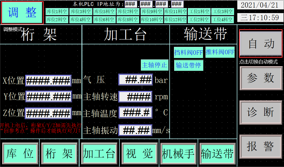 包含PLC可編程控制器軟件和HMI人機交互軟件,相互配合完成工業(yè)產(chǎn)線從取料、加工、檢測、分揀、次品推料、成品上架等完整工藝流程。HMI人機交互具有調(diào)整模式和自動模式。調(diào)整模式支持工業(yè)設(shè)備參數(shù)調(diào)整,可單獨調(diào)試某一個設(shè)備,比如庫位占用狀態(tài)、堆垛機控制、加工臺模擬加工控制、傳送帶控制等;自動模式支持模擬加工流水線自動運行,無需人工干預(yù)。