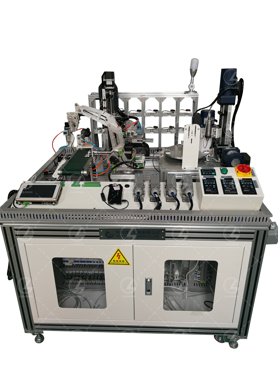實訓(xùn)臺由立體倉儲單元、轉(zhuǎn)臺模擬加工單元、視覺檢測單元、搬運單元、流水線單元、次品分揀單元、電氣控制箱等組成。配備PLC主控模塊、HMI觸摸屏、電源模塊、驅(qū)動模塊、人機交互模塊等,包含步進電機驅(qū)動、減速電機驅(qū)動器、變頻器、氣缸,及光電傳感器、金屬接近傳感器、編碼器等各類常用傳感器。