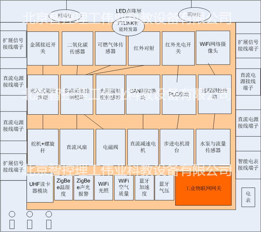 實(shí)訓(xùn)臺(tái)主要由工業(yè)物聯(lián)網(wǎng)網(wǎng)關(guān)、無(wú)線(xiàn)傳感節(jié)點(diǎn)、工業(yè)傳感器執(zhí)行器件、以及臺(tái)體框架(含電源接線(xiàn)端子、傳感器接線(xiàn)端子、通信接口面板等)組成。布局如圖所示。