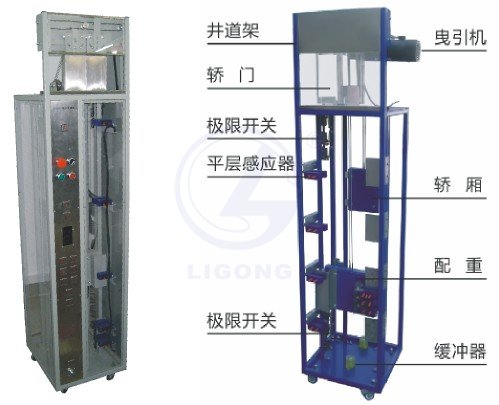 1、模型電梯設(shè)4層4站,由模擬井道架、轎廂、對重、曳引機(jī)、電梯門、門電機(jī)、各層站外呼盒及主要安全裝置組成,固定設(shè)置在實(shí)驗(yàn)臺側(cè)面。模擬井道架內(nèi)需配置用于檢測轎廂位置的樓層感應(yīng)器、平層感應(yīng)器(與實(shí)際電梯相似)等,其接線端子引至模擬井道架的插接孔上。井道架采用金屬材料為主體支架,有機(jī)玻璃封閉。