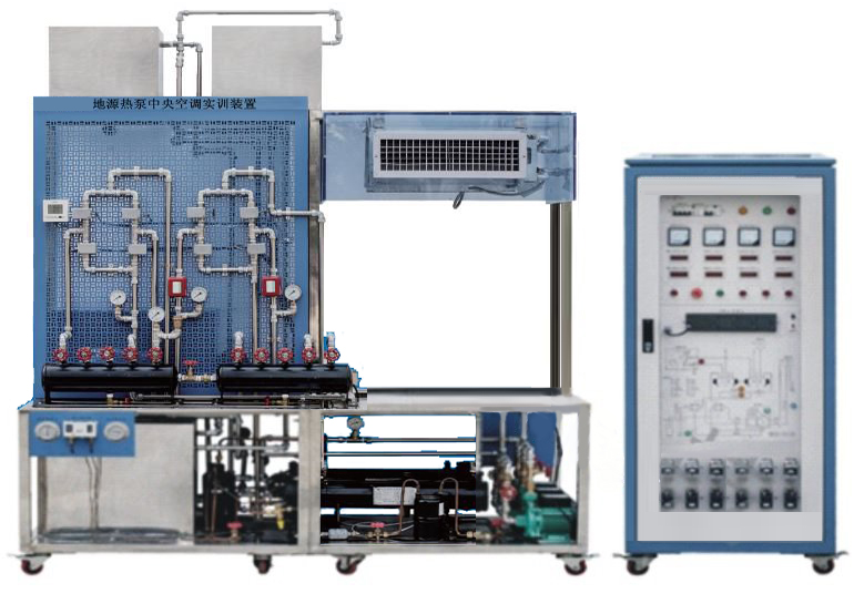 地源熱泵空調(diào)系統(tǒng)由制冷機組、模擬水井、空調(diào)系統(tǒng)、生活衛(wèi)生供水系統(tǒng)、控制系統(tǒng)、實訓(xùn)臺等組成。實訓(xùn)臺采用不銹鋼底架結(jié)構(gòu),結(jié)構(gòu)堅固,造型美觀大方;桌面用于安裝電源控制屏并提供一個寬敞舒適的工作臺面。