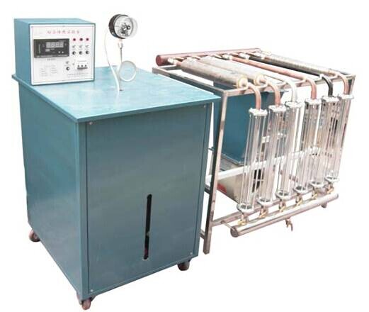 實驗臺由電熱蒸汽發(fā)生器、一組表面狀態(tài)不同(光管、涂黑、鍍鉻、管外加翅片以及兩只用不同保溫材料保溫)的六根銅管、配汽管、冷凝水儲水器(可計量)及支架等組成。強制通風時,配有一臺可移動的風機,用它來對管子次風。因而,實驗臺可以進行自然對流和強迫對流的傳熱實驗。通過實驗,可對各種不同影響傳熱因素進行分析,從而建立起影響傳熱因素的初步認識和概念。
