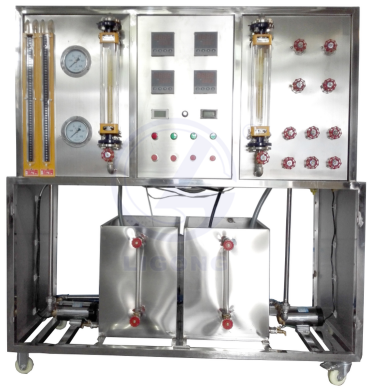套管式換熱器,板式換熱器,列管式換熱器,冷、熱水防腐水泵,冷、熱水轉子流量計,冷、熱水不銹鋼原水箱及加熱水箱,順、逆流調節(jié)閥門組,阻力測試壓力表及U型差壓計,加熱功率由固態(tài)調壓模塊無極調節(jié),萬能信號輸入巡檢儀顯示溫度,電流表,電壓表,不銹鋼臺架及控制屏等。