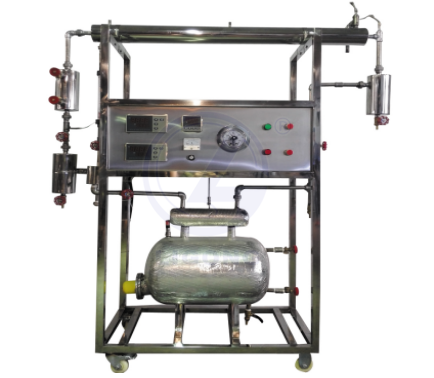 電蒸汽鍋爐、套管換熱器、蒸汽冷凝罐、蒸汽及水流量測試設(shè)備、加熱由固態(tài)調(diào)壓模塊無極調(diào)節(jié),由多路巡檢儀顯示的溫度測試系統(tǒng),不銹鋼臺架及控制屏等。