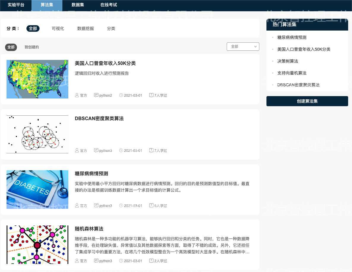 人工智能實(shí)訓(xùn)課程資源共計(jì)200多個(gè),資源涵蓋了操作系統(tǒng)類、數(shù)據(jù)庫(kù)類、編程語言類、統(tǒng)計(jì)分析類、機(jī)器學(xué)習(xí)類、神經(jīng)網(wǎng)絡(luò)與深度學(xué)習(xí)類、自然語言處理類、機(jī)器視覺類、智能硬件類課程等諸多方面課程,課程類型包括基礎(chǔ)實(shí)訓(xùn)、關(guān)鍵技術(shù)掌握、應(yīng)用創(chuàng)新等,是一個(gè)綜合性的學(xué)習(xí)研究平臺(tái);平臺(tái)配合專用的資源監(jiān)控系統(tǒng)、課程監(jiān)控系統(tǒng),可實(shí)時(shí)的監(jiān)控整個(gè)平臺(tái)的硬件資源負(fù)載以及學(xué)生學(xué)習(xí)的狀態(tài),可幫助教師合理的安排課程及對(duì)應(yīng)資源。