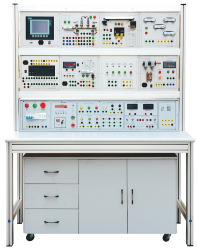 該裝置采用鋁木結(jié)構(gòu)實(shí)訓(xùn)臺(tái),實(shí)訓(xùn)臺(tái)架由實(shí)訓(xùn)屏(含電源控制屏)、實(shí)訓(xùn)桌、實(shí)訓(xùn)儲(chǔ)物柜三大部分組成。實(shí)訓(xùn)屏包括電源指示和控制單元、時(shí)間管理器(含電源保護(hù))單元、指示燈和按鈕單元、選擇開關(guān)和蜂鳴器及繼電器單元、儀表單元、直流電源單元,電源控制屏的左右兩側(cè)分別裝有一個(gè)兩插插座,將外部電源進(jìn)線端裝在電源控制屏的左側(cè)(采用航空插連接結(jié)構(gòu));實(shí)訓(xùn)屏上部采用三根不銹鋼型材組成通用實(shí)訓(xùn)模塊固定結(jié)構(gòu),一次可擺放8個(gè)實(shí)訓(xùn)模塊,模塊采用標(biāo)準(zhǔn)化結(jié)構(gòu)、互換性強(qiáng),根據(jù)實(shí)訓(xùn)內(nèi)容的需要調(diào)換實(shí)訓(xùn)模塊;存儲(chǔ)柜用于存放工具材料及模塊。