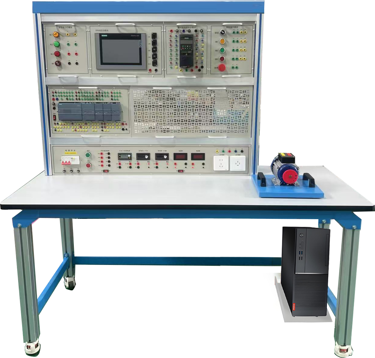PLC實驗裝置由控制屏、實訓桌、主機實訓組件、實訓模塊(含豐富的工業(yè)現(xiàn)場設(shè)備模擬實訓對象)、變頻器掛箱、觸摸屏掛箱、交直流電機、總線單元、通信模塊、電機導軌、測速機構(gòu)等組成。