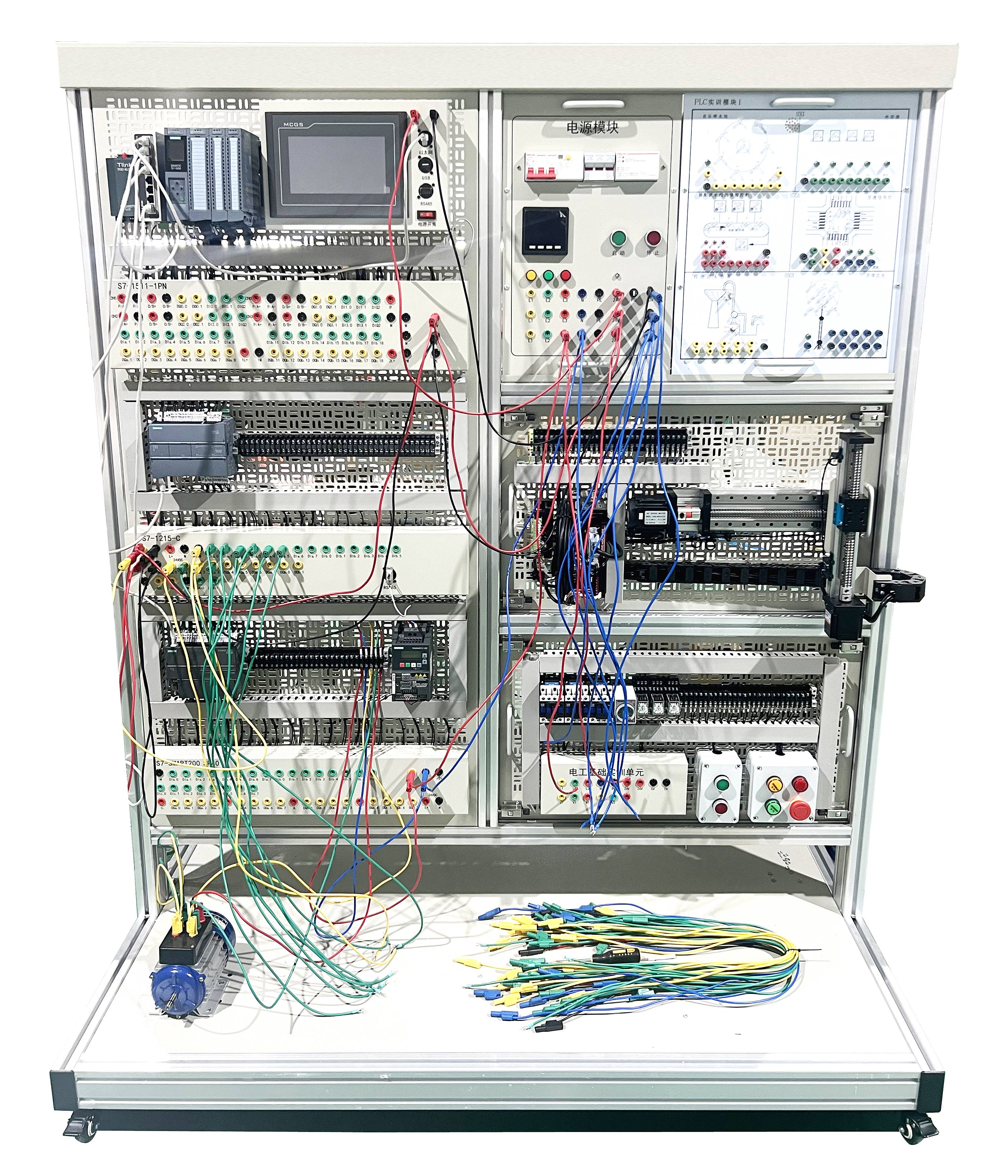 實(shí)訓(xùn)裝置由S7-1500單元、S7-1200單元、變頻調(diào)速單元、伺服電機(jī)、實(shí)訓(xùn)組件、電工基礎(chǔ)實(shí)訓(xùn)單元二維絲桿控制單元、觸摸屏單元、以太網(wǎng)交換機(jī)、交流電機(jī)等組成。