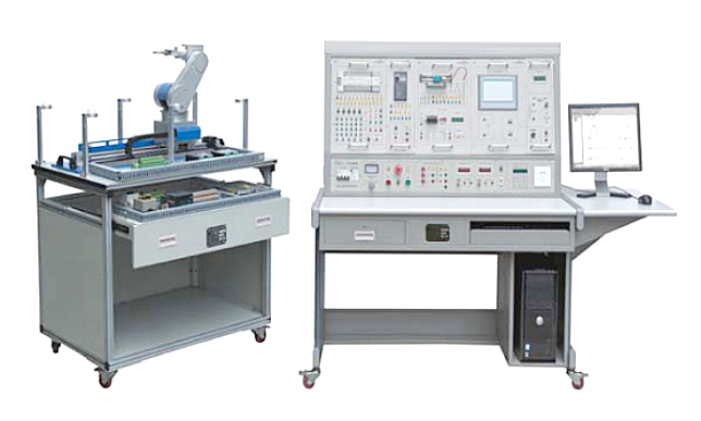 實訓(xùn)裝置由控制屏、實訓(xùn)桌、PLC 模塊、通信模塊、變頻器模塊、模擬實訓(xùn)模塊、觸摸屏模塊、五自由度機械手、交流電機、電機導(dǎo)軌、測速機構(gòu)、加載系統(tǒng)、MCGS 工控組態(tài)軟件(配加密狗)等組成。