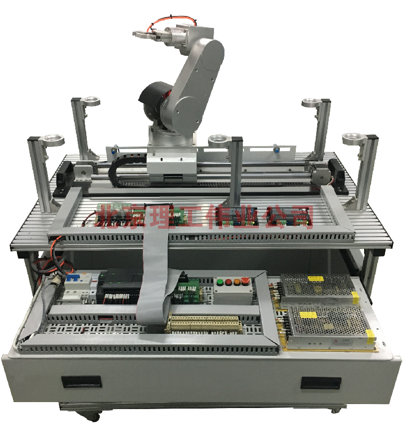 實訓系統(tǒng)由型材實訓桌、五自由度機器人及電氣控制三部分組成。五自由度機器人運動機械部分包括底座水平移動、底座旋轉(zhuǎn)、大臂上下擺動、小臂上下擺動、手爪旋轉(zhuǎn),用于實現(xiàn)定位功能,手爪夾緊與松開,采用電動手爪,伺服電機驅(qū)動,齒輪傳動,開閉角度自由控制,可對直徑60mm以內(nèi)的任意物體進行抓取,具有力矩保持、速度可調(diào)等特點。桌面設(shè)有六個工位臺,在教學過程中可根據(jù)考核要求,調(diào)節(jié)工作臺位置點。