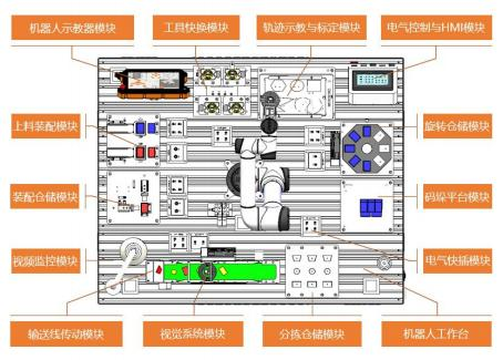 工作臺整體由兩個基礎(chǔ)臺拼接而成,更具空間靈活,拆卸方便等特點。臺面采用標準鋁型材,機器人 及功能模塊可根據(jù)需求改變布局位置,所有功能模塊采用手擰螺栓方式固定,可實現(xiàn)無工具快速拆裝與更 換。每個模塊電氣部分配置了獨立的電氣接線盒和快速航插,可實現(xiàn)模塊整體機械和電氣快速安裝部署, 還可根據(jù)需求更換或添加功能模塊進行功能擴展。