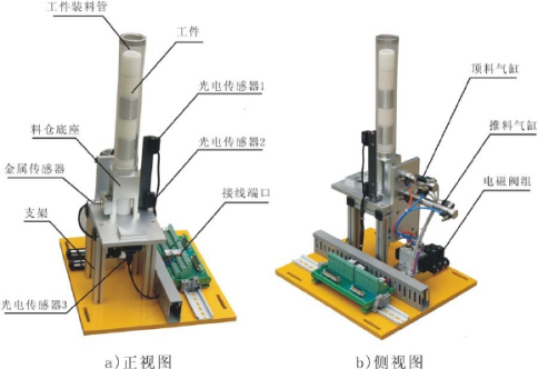 主要由井式工件庫(kù)、推料氣缸、物料臺(tái)、光電傳感器、磁性開關(guān)、電磁閥、支架、機(jī)械零部件構(gòu)成。