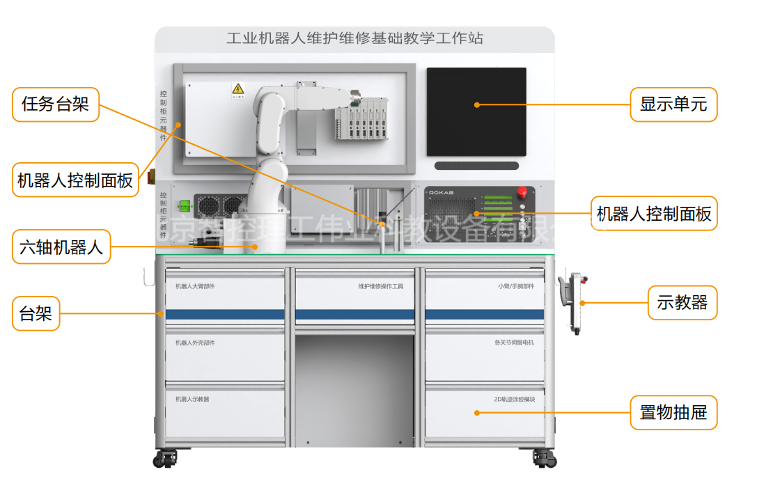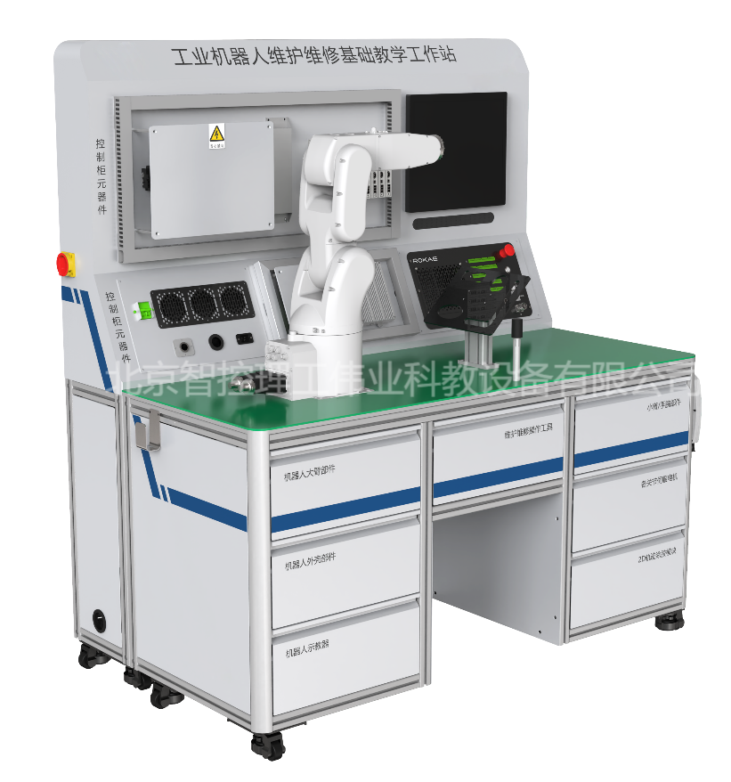 工業(yè)機(jī)器人維護(hù)維修基礎(chǔ)教學(xué)工作站,以工業(yè)機(jī)器人本體及其控制系統(tǒng)最常見維護(hù)維修操作為核心,通過對(duì)典型故障的診斷和排除,按照規(guī)范步驟完成對(duì)工業(yè)機(jī)器人本體的拆裝過程,并根據(jù)圖紙要求搭建控制系統(tǒng)并接線,由零件級(jí)深入了解工業(yè)機(jī)器人的構(gòu)成形式和運(yùn)動(dòng)方式,掌握基礎(chǔ)維護(hù)維修技能。工作站配套了與生產(chǎn)廠家完全相同的工裝、工具,讓學(xué)生可以在教學(xué)環(huán)境中充分體驗(yàn)高精度機(jī)電設(shè)備的生產(chǎn)工藝要求,確實(shí)掌握維護(hù)維修技能。