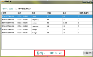 稱重功能首先通過(guò)RFID讀寫(xiě)器讀出商品上RFID標(biāo)簽信息,并將此商品在電子秤上稱出重量,同時(shí)輸入商品單價(jià)并結(jié)算出總價(jià),*后將商品的名稱,價(jià)格信息通過(guò)標(biāo)簽打印機(jī)打印出對(duì)應(yīng)信息和用于溯源與結(jié)算的二維碼。