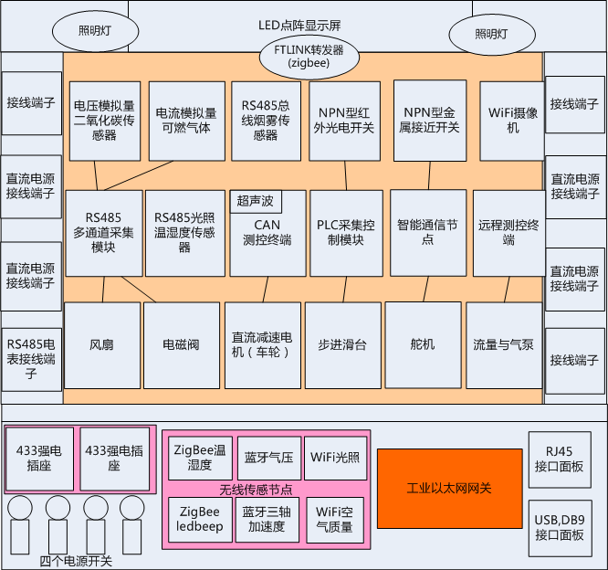 1、標(biāo)配網(wǎng)孔操作板、四組直流供電板、四組有線傳感器的供電通信板、六個(gè)無線傳感器節(jié)點(diǎn)、一個(gè)工業(yè)以太網(wǎng)網(wǎng)關(guān)、兩個(gè)無線強(qiáng)電控制插座、四種交直流電源按鈕、指示燈、點(diǎn)陣顯示屏等,為行業(yè)創(chuàng)新應(yīng)用提供硬件支持。
