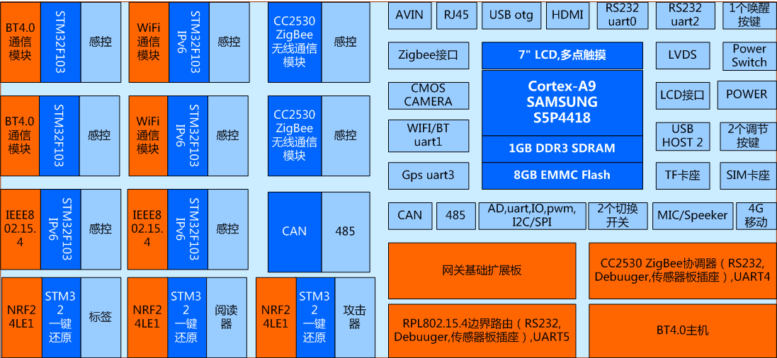 1)能夠滿足單片機(jī)接口及應(yīng)用、傳感器接口及應(yīng)用、無線傳感網(wǎng)、嵌入式操作系統(tǒng)開發(fā)、嵌入式Linux應(yīng)用開發(fā)、Android移動應(yīng)用開發(fā)等課程要求。 2)能夠組建藍(lán)牙、WiFi、IEEE802.15.4、ZigBee四種無線網(wǎng)絡(luò),實(shí)現(xiàn)數(shù)據(jù)的無線傳輸; 3)能夠?qū)⑺{(lán)牙、WiFi、IEEE802.15.4無線網(wǎng)絡(luò)經(jīng)IPV6協(xié)議、Zigbee節(jié)點(diǎn)經(jīng)ZStack協(xié)議融合在一個(gè)拓?fù)鋱D中,在界面上顯示藍(lán)牙、WiFi、RPL802.15.4、ZigBee等節(jié)點(diǎn)的傳感器數(shù)據(jù)或執(zhí)行器狀態(tài),并實(shí)時(shí)流動地顯示各個(gè)傳感器數(shù)據(jù)的上、下行走向; 4)要求藍(lán)牙、WiFi、IEEE802.15.4三種傳感器節(jié)點(diǎn)均具有唯一的IPv6地址,統(tǒng)一采用IPv6協(xié)議組包通信。 5)要求網(wǎng)關(guān)支持Linux、Android雙操作系統(tǒng),支持一鍵燒寫、一鍵切換。 6)要求在保證網(wǎng)關(guān)接入互聯(lián)網(wǎng)的前提下,能夠配置接入云服務(wù)平臺,并實(shí)現(xiàn)移動端傳感器數(shù)據(jù)的采集顯示和執(zhí)行器的遠(yuǎn)程控制。 二、硬件資源 1.Cortex-A9網(wǎng)關(guān)(1個(gè)) 1)核心板資源: (1)CPU:Cortex-A9四核心的Samsung s5p4418,主頻1.4GHz; (2)GPU:MAIL-400,3D圖形加速 (3)內(nèi)存: 1GB DDR3; (4)EMMC: 8GB; (5)核心板+底板設(shè)計(jì):核心板加裝屏蔽罩,郵票孔方式與底板連接,抗干擾能力更強(qiáng),比插針式更穩(wěn)定可靠。要求引出核心板信號線,不少于188PIN。 2)網(wǎng)關(guān)主板資源: (1)LCD接口:7寸IPS電容屏(16:9),分辨率1024×600; (2)USB接口:2路USB_HOST 2.0輸出,1路USB OTG; (3)Ethernet接口:核心板內(nèi)置千兆IP,外加不超過3RMB的PHY芯片即可,支持10/100/1000M,RJ45接口; (4) 串口:2路3線RS232,1路TTL接口,1路RS485,1路Bluetooth; (5)CAN總線接口:1路; (6)RS485總線接口:1路; (7)HDMI 接口:HDMI1.4a,*大支持1920*1080高清數(shù)字輸出; (8)LVDS液晶屏接口:單通道,*大支持1920*1080; (9)攝像頭接口:1路CMOS并行接口,*大支持800萬像素; (10)AV接口:1路模擬視頻母口輸入; (11)外部存儲擴(kuò)展接口:SD卡、TF卡接口; (12)音頻接口: 1路MIC輸入,1路1. 8w喇叭; (13)按鍵:1個(gè)復(fù)位按鍵、1個(gè)休眠喚醒按鍵,2個(gè)音量鍵; (14) 藍(lán)牙WiFi:板載藍(lán)牙WiFi二合一模塊; (15)Mini PCIe接口:標(biāo)準(zhǔn)可插入4G通信模模塊; (16)24Pins應(yīng)用擴(kuò)展接口:用于處理器外設(shè)接口擴(kuò)展功能,包含3路串口、1路PWM、1路IIC、1路ADC、8個(gè)GPIO,5V電源。 2.網(wǎng)關(guān)IO基礎(chǔ)擴(kuò)展板(1個(gè)) 由網(wǎng)關(guān)直接驅(qū)動。采用HC595串入并出特點(diǎn),使用較少IO擴(kuò)展更多功能,默認(rèn)地址0x01。1路可調(diào)電位器模擬AD采樣通道,1路PWM驅(qū)動的蜂鳴器,5個(gè)觸摸按鍵,5個(gè)LED指示燈。 3.三路繼電器擴(kuò)展板(1個(gè)) 由網(wǎng)關(guān)直接驅(qū)動。采用HC595串入并出特點(diǎn),使用較少IO擴(kuò)展更多功能,默認(rèn)地址0x10。 可控制3路繼電器,線圈機(jī)械式觸點(diǎn),1個(gè)常開,1個(gè)常閉,*大負(fù)載10A/277V AC。 4. ZigBee協(xié)調(diào)器(1個(gè)) 與網(wǎng)關(guān)的TTL UART連接。采用CC2530單片機(jī)外設(shè)接口、射頻通信與ZStack協(xié)議棧的方案,具備Zigbee建網(wǎng)功能,具有2個(gè)組網(wǎng)狀態(tài)及無線傳輸指示燈,2個(gè)功能按鍵,提供傳感器模塊接口、RS232接口、調(diào)試下載接口。 5. IEEE802.15.4主機(jī)(1個(gè)) 與網(wǎng)關(guān)的TTL UART連接。采用CC2530射頻功能與802.15.4的從機(jī)組建射頻網(wǎng)絡(luò),接收從機(jī)信息,向從機(jī)發(fā)送命令。具有2個(gè)組網(wǎng)狀態(tài)及無線傳輸指示燈,2個(gè)功能按鍵,提供傳感器模塊接口、RS232接口、調(diào)試下載接口。 6.無線傳感網(wǎng)通信節(jié)點(diǎn)(12個(gè)) 1)微控制器主板硬件資源 (1)Cortex-M3核心主板(9個(gè)) 處理器基于ARM Cortex-M3核心的STM32F103,*高主頻72Mhz,內(nèi)部Flash 256KB,RAM 48KB。 具有1個(gè)0.96寸OLED屏,能夠顯示MAC地址、上下級關(guān)系、傳感器數(shù)據(jù)、網(wǎng)絡(luò)信息等。 具有4個(gè)組網(wǎng)狀態(tài)及無線傳輸指示燈,2個(gè)功能按鍵、1個(gè)JTAG調(diào)試接口、1個(gè)24PIN的無線射頻接口,1組20*2PIN傳感器接口; 標(biāo)配ARM仿真器、串口下載仿真調(diào)試轉(zhuǎn)接板。 運(yùn)行IPv6協(xié)議棧實(shí)現(xiàn)無線通信的功能。 (2)CC2530核心主板(3個(gè)) 處理器基于CC2530F256,具有2個(gè)組網(wǎng)狀態(tài)及無線傳輸指示燈,2個(gè)功能按鍵、1個(gè)JTAG調(diào)試接口、1個(gè)24PIN的無線射頻接口,1組20*2PIN傳感器接口; 標(biāo)配下載仿真器。 2)無線傳感網(wǎng)通信模塊 (1)藍(lán)牙通信模塊(3個(gè)):采用UART接口的內(nèi)置協(xié)議棧方案,設(shè)置從機(jī)模式,與主機(jī)配對后,將微控制器采樣數(shù)據(jù)傳輸給主機(jī)。 (2)WiFi通信模塊(3個(gè)):采用UART接口的內(nèi)置TCP/UDP/HTTP協(xié)議棧方案,支持設(shè)置為AP、STA的工作模式,與網(wǎng)關(guān)通信后,將微控制器采樣數(shù)據(jù)傳送給主機(jī),或者接收主機(jī)的控制命令控制執(zhí)行器。 (3)IEEE802.15.4通信模塊(3個(gè)):基于CC2530射頻組網(wǎng)通信方案,與邊界路由器組網(wǎng),實(shí)現(xiàn)傳感器數(shù)據(jù)的雙向交互。 (4)ZigBee通信模塊(3個(gè)):基于CC2530+ZStack協(xié)