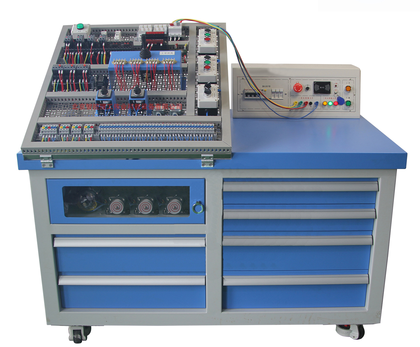 (1)采用不銹鋼材質(zhì),用于機床電氣裝調(diào)維修實訓和考核。由一線品牌的電器元件(空氣開關(guān)、熔斷器、交流接觸器、時間繼電器、熱繼電器、按鈕、指示燈、接線端子等)、通用安裝板、角度調(diào)節(jié)機構(gòu)等構(gòu)成。角度調(diào)節(jié)機構(gòu)根據(jù)人體工程學設(shè)計,安裝板可在0-75°調(diào)節(jié);