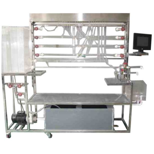 雷諾實驗管、伯努利實驗管、沿程阻力管、局部阻力管、水泵、秒表、玻璃溫度計、測壓計、刻度標尺、文丘里流量計、實驗水箱、計量水箱、蓄水箱、指示液盒、壓力傳感器、流量傳感器、溫度傳感器、萬能信號輸入巡檢儀、軟件、不銹鋼框架、控制屏。