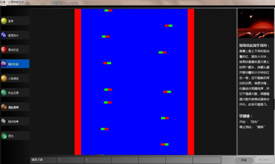 本系統(tǒng)是根據(jù)人的注意力分配習(xí)慣,并應(yīng)用先進(jìn)的計(jì)算機(jī)技術(shù)開發(fā)研制的操縱機(jī)能測試儀器。受測者只要按要求轉(zhuǎn)動(dòng)方向盤,操縱黃色小條便可以完成測試。屏幕上有上下同時(shí)移動(dòng)的紅綠色小方塊,被測試者操縱顯示屏上的兩個(gè)箭頭,使箭頭避開移動(dòng)著的小方塊紅色一側(cè),并且不能觸及兩邊的邊界,尚若出錯(cuò),儀器會(huì)出現(xiàn)蜂鳴聲,并記下錯(cuò)誤次數(shù),系統(tǒng)根據(jù)錯(cuò)誤次數(shù)對(duì)被測者做出評(píng)價(jià)。