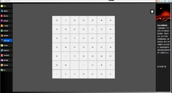開始測試后,屏幕中出現(xiàn) 0-48 個(gè)按照 7*7 方格隨機(jī)排列的 49 個(gè)數(shù)字,要求受試人由“0”開始,按照從小到大的順序,在方格中依次將 0-48 之間的所有數(shù)字全部找出,找到數(shù)字后點(diǎn)擊鼠標(biāo)左鍵劃掉該數(shù)字。記錄受試者完成的時(shí)間。