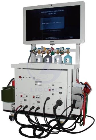 四種焊接(割)設(shè)備、及三種滅火器都集成在設(shè)備上,統(tǒng)一管理,分類操作。設(shè)備上的二氧化碳焊機(jī)、氬弧焊機(jī)、電焊機(jī)、相關(guān)氣瓶及儀表與真實設(shè)備一模一樣,操作者考試時需要根據(jù)真實焊接時的要求調(diào)節(jié)設(shè)備(比如開氣瓶,調(diào)節(jié)電壓,電流等)。