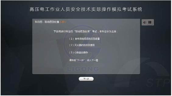 系統(tǒng)軟件功能豐富、合理、創(chuàng)新,該考試系統(tǒng)軟件是根據(jù)大綱里所列舉的考點及評分權(quán)重來設(shè)計的,考試內(nèi)容100%符合大綱要求的考點??荚噧?nèi)容包含4個科目,科目一(安全用具使用)、科目二(安全操作技術(shù))、科目三(作業(yè)現(xiàn)場安全隱患排除)、科目四(作業(yè)現(xiàn)場應(yīng)急處置)。