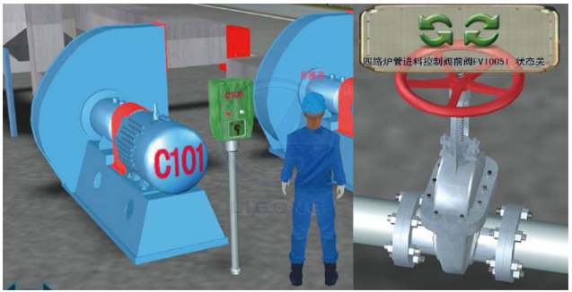 按實(shí)際現(xiàn)場(chǎng)設(shè)備的外形、尺寸、顏色、位置關(guān)系及距離、管線連接方式、音響效果等物理屬性建立3D場(chǎng)景和設(shè)施,包括防火堤、滅火器、消防水炮等各種安全設(shè)施。